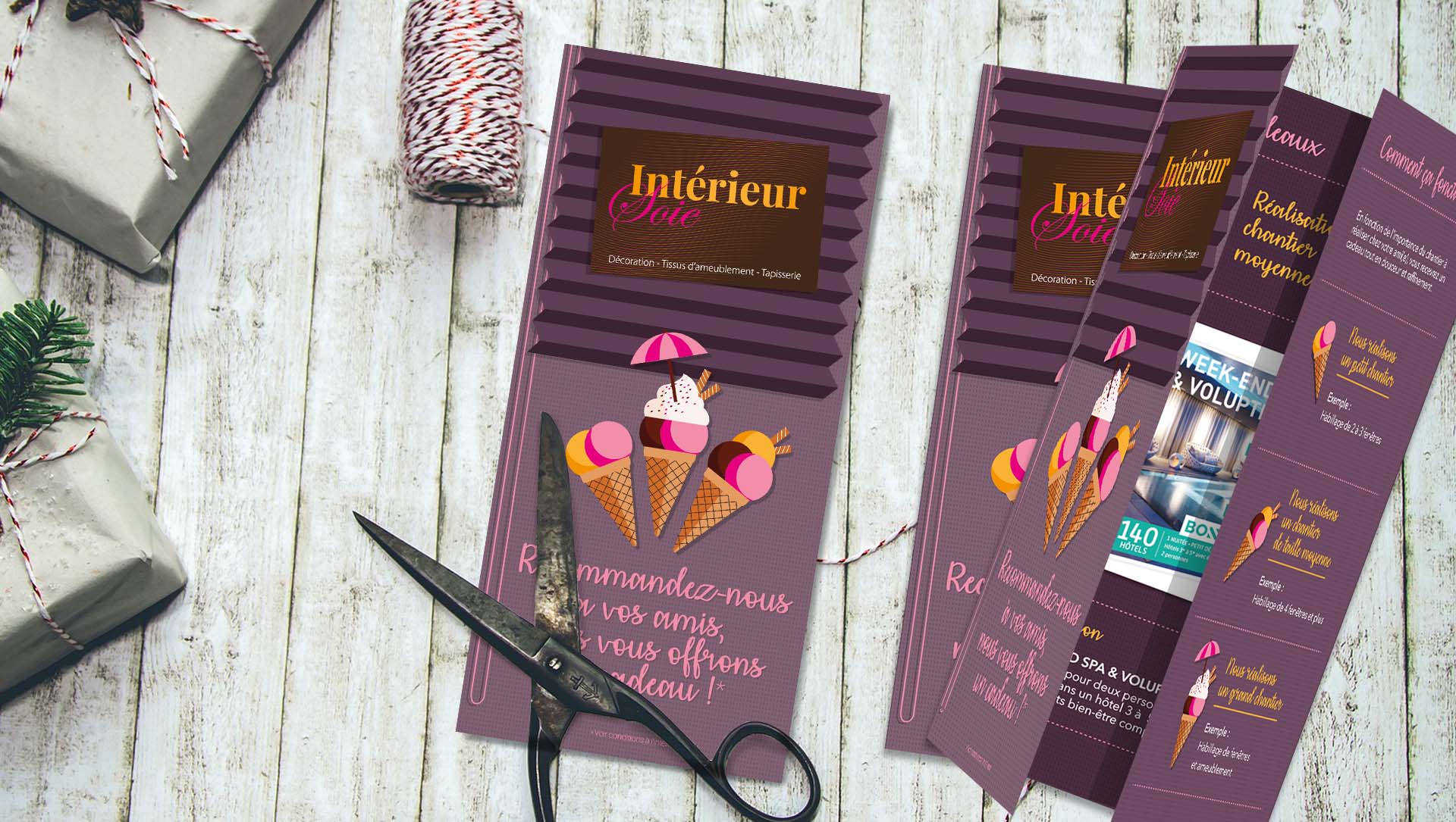 En vue de favoriser le réseautage et le bouche à oreille, Intérieur Soie nous a demandé de leur créer un carton de parrainage qu'ils puissent remettre à tous leurs clients une fois leurs chantiers réalisés.